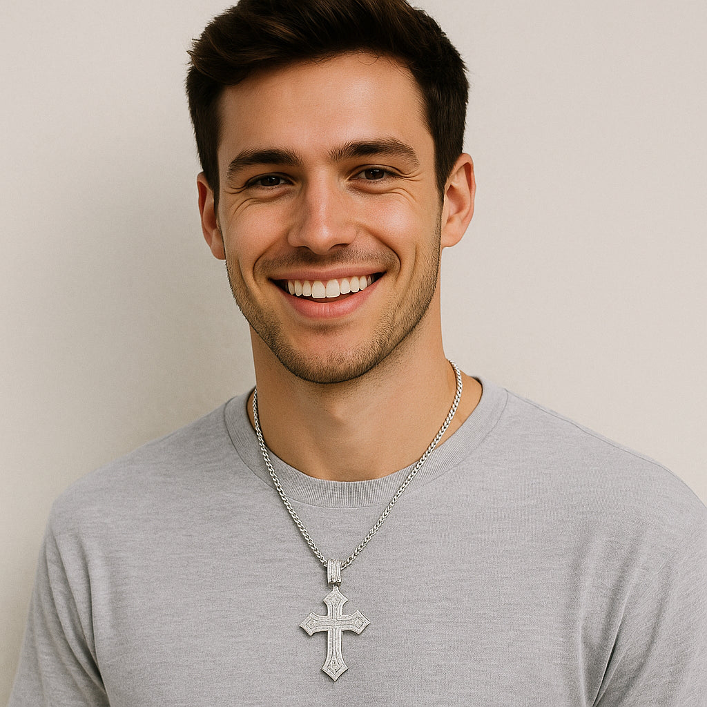 This striking men's jewelry design highlights an iced-out baguette men's pendants layout crafted with a premium silver-plated finish. Each baguette stone adds sharp brilliance and clean geometric shine, creating a modern and confident cross silhouette. Perfect for men who want expressive style, this pendant elevates streetwear, nightlife looks, and daily outfits with refined attitude.