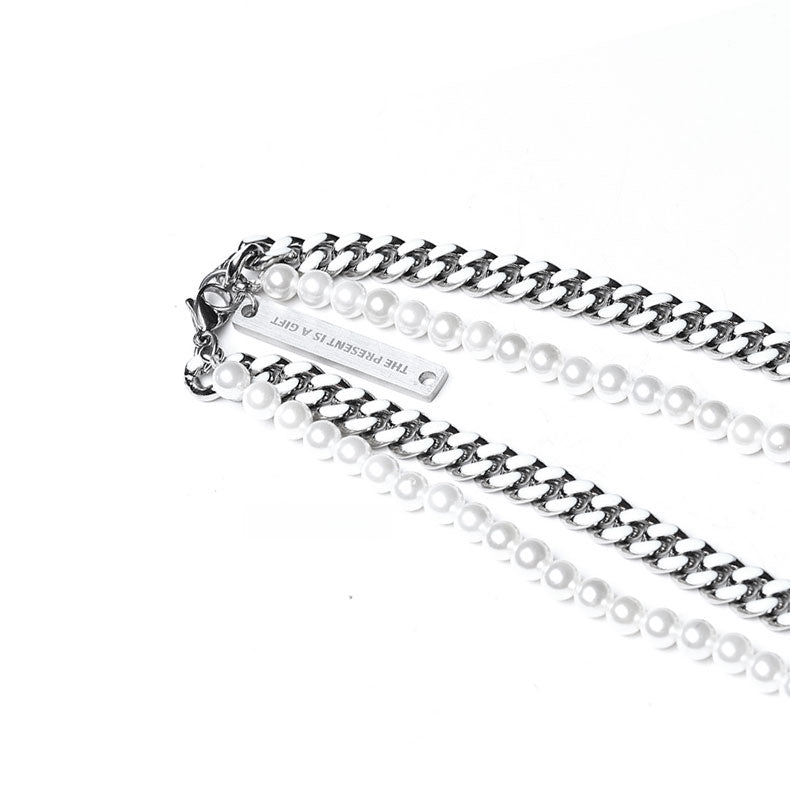 Pearl Cuban Link Cross Layered Pendant – Silver Finish