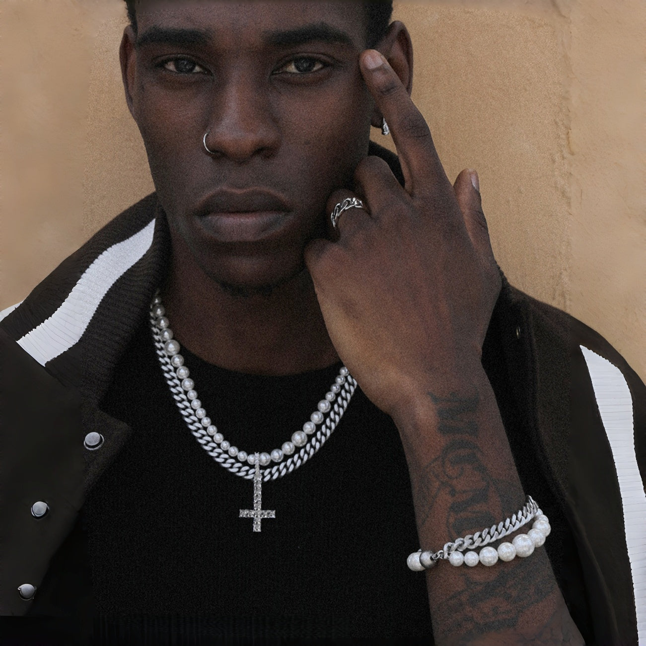 This distinctive men's jewelry design showcases a Pearl Cuban Link Cross layered men's pendants style in a clean silver tone. The mix of glossy pearls, Cuban link texture, and a meaningful cross creates strong contrast and visual depth. Perfect for men who enjoy expressive accessories, this pendant adds individuality and modern confidence to any look.
