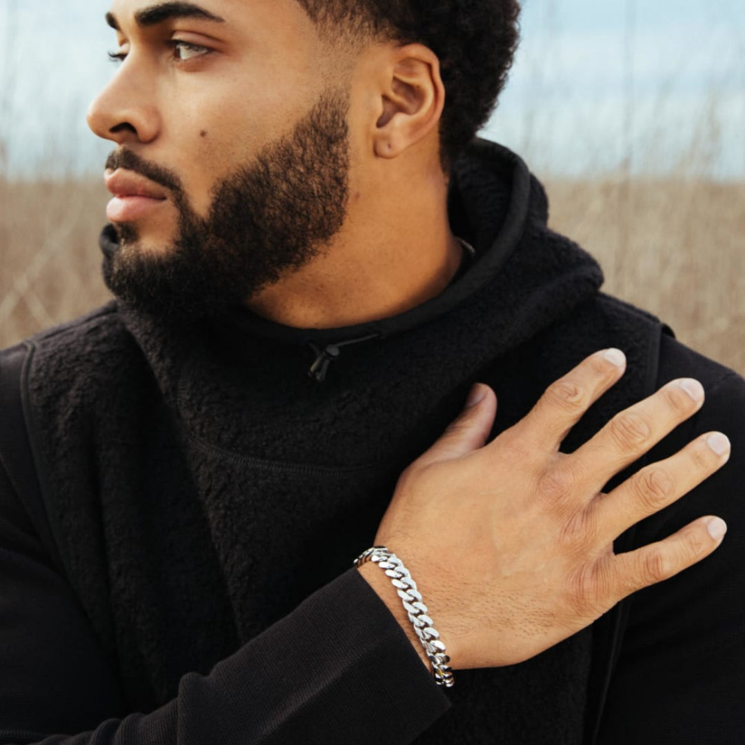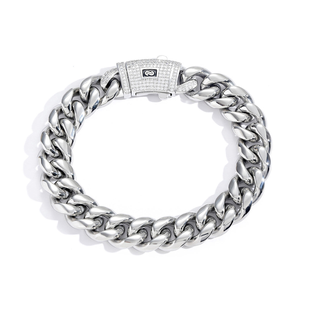 This 10mm Cuban link bracelet is iced out with CZ stones for bold brilliance, finished in silver for shine and durability. With its curb-style links and sparkling detail, it delivers both classic appeal and modern streetwear energy. A standout in men's jewelry, it expands collections of men's bracelets and pairs seamlessly with matching men's chains for a complete and coordinated look.