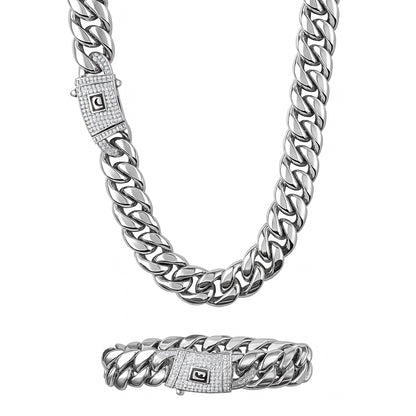 This 10mm Cuban link chain set includes both a chain and matching bracelet, fully iced out with CZ stones for maximum brilliance. Finished in silver for shine and durability, it combines the bold curb-style look with modern streetwear appeal. A standout in men's jewelry, this set enriches collections of men's chains and men's bracelets, offering a complete and coordinated style for casual wear or special occasions.