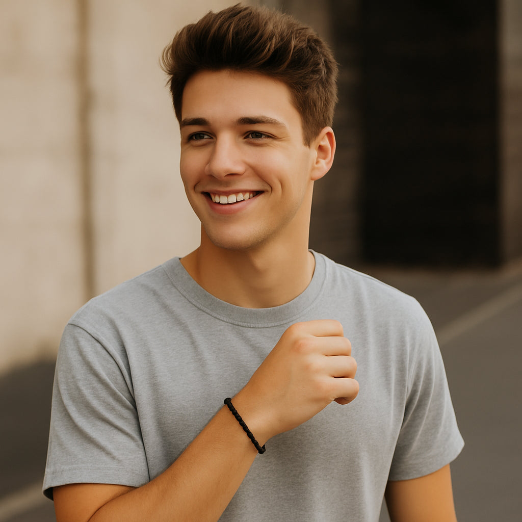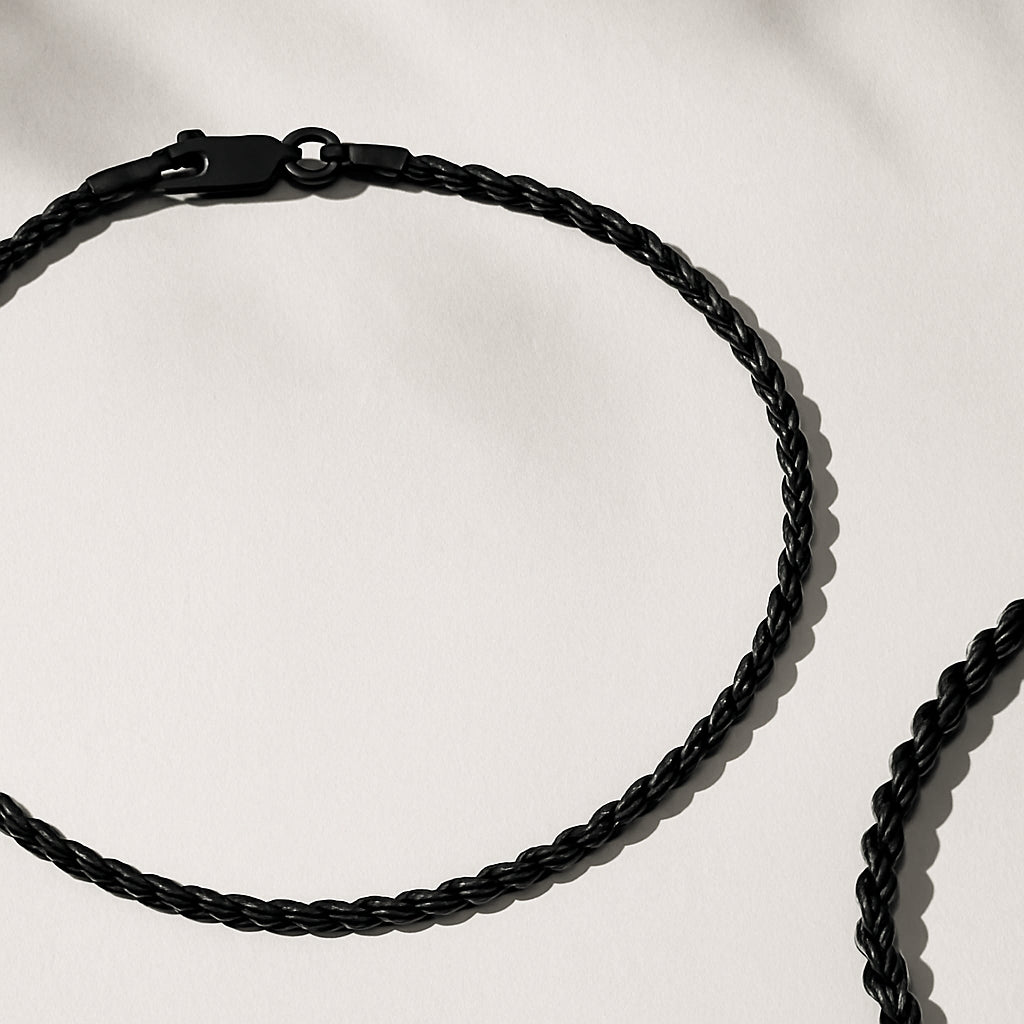 This 3mm rope bracelet is crafted with tightly woven links for strength and style, enhanced by a black gold finish for a unique and edgy look. Perfect for casual wear or layering with statement pieces, it adds depth to any outfit. A versatile option in men's jewelry, it complements collections of men's bracelets and pairs seamlessly with men's chains for a coordinated streetwear vibe.