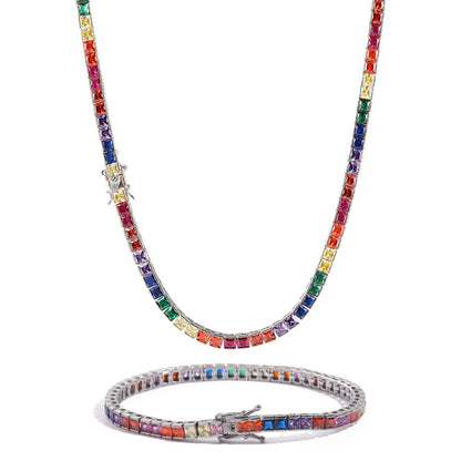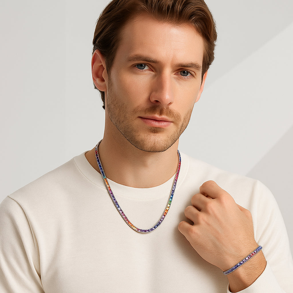 This stunning men's jewelry ensemble includes a 4mm rainbow square men's chains and matching tennis bracelet, both plated in sleek silver. Each square stone radiates vivid brilliance, creating a perfect balance between luxury and personality. Ideal for parties, night events, or daily wear, this men's jewelry set celebrates confidence, color, and contemporary style for modern men.