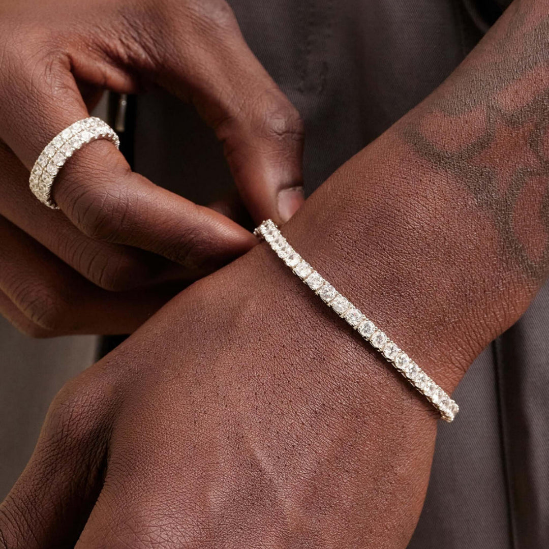 This 4mm tennis bracelet is crafted with brilliant CZ stones in a sleek setting, finished in silver for lasting shine and durability. Slim yet striking, it’s perfect for daily wear, layering with chains, or elevating streetwear looks. A refined addition to men's jewelry, it enhances collections of men's bracelets and pairs effortlessly with matching men's chains for a coordinated style.