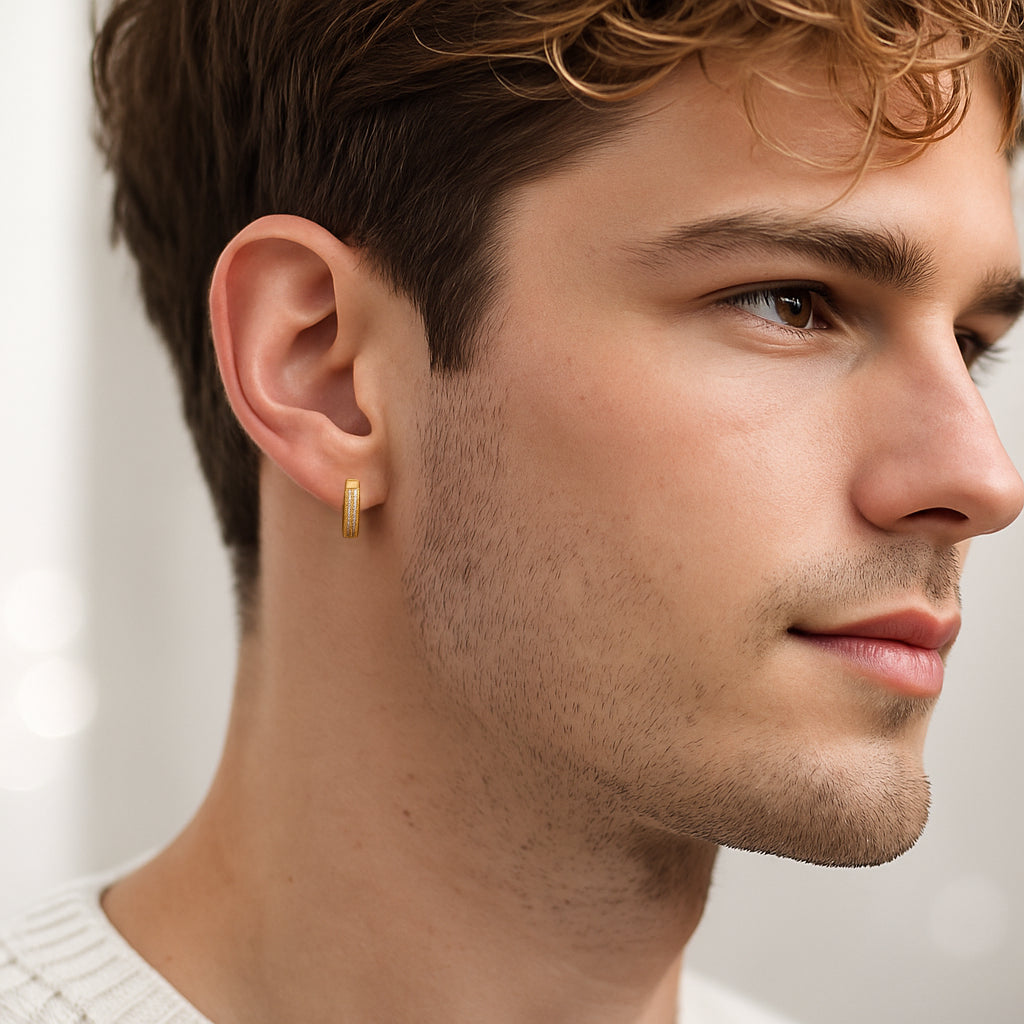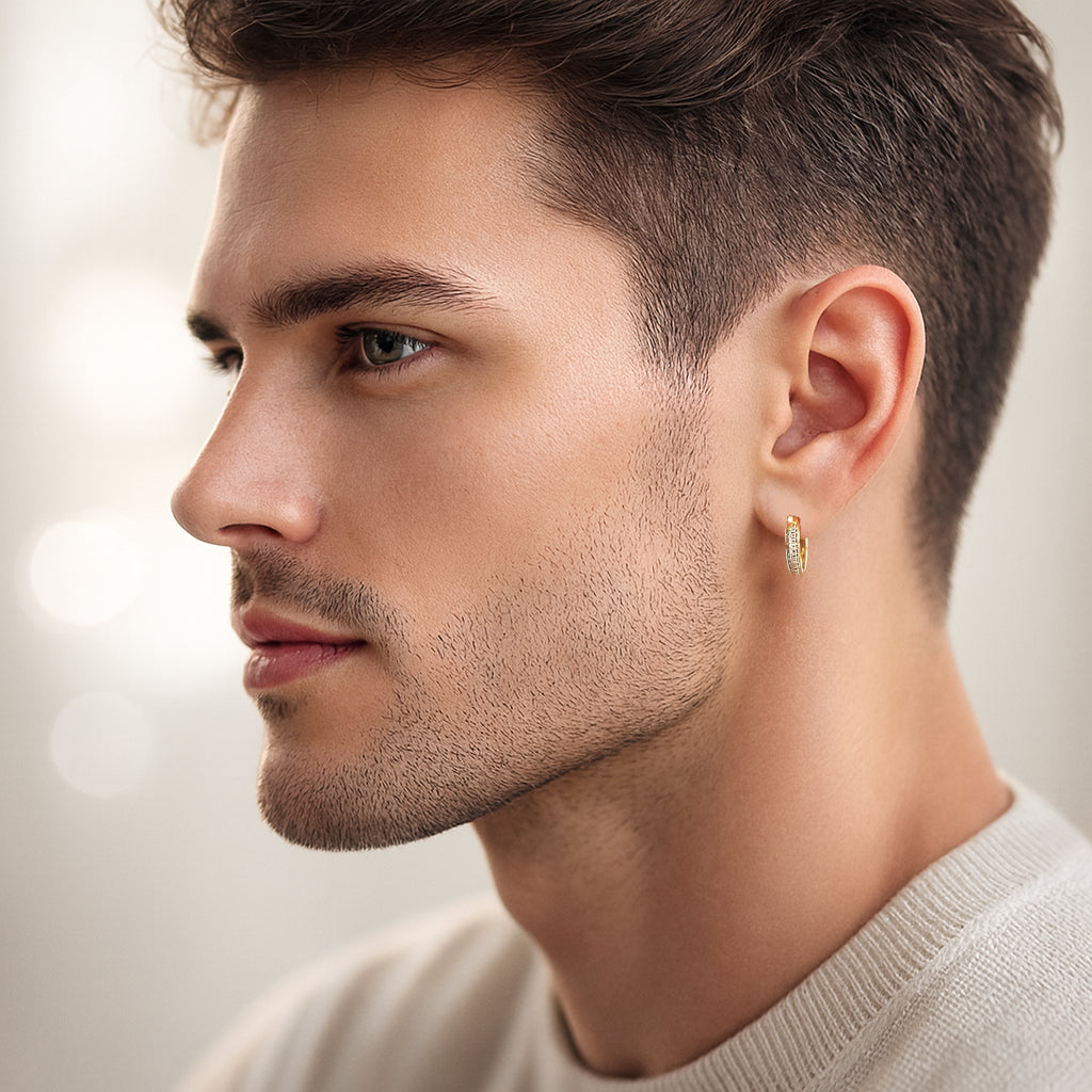 These striking men's jewelry Iced Hoop men's earrings feature a polished 14K gold finish paired with shimmering stones for elevated shine. The clean hoop silhouette delivers a confident modern look, perfect for men who enjoy expressive accessories with a luxurious touch. Ideal for daily wear, nightlife, or standout fashion moments, these hoops bring both style and personality.