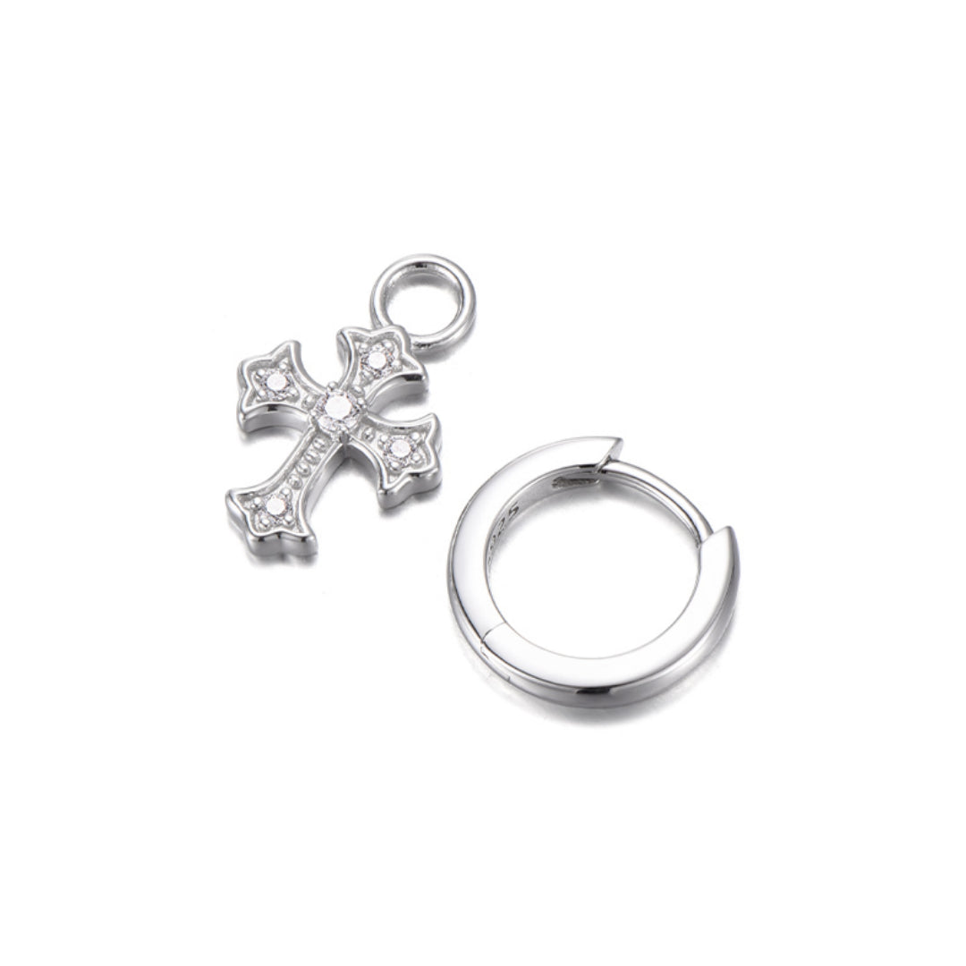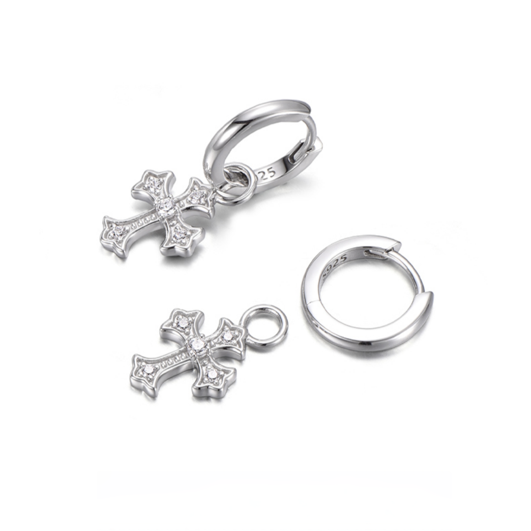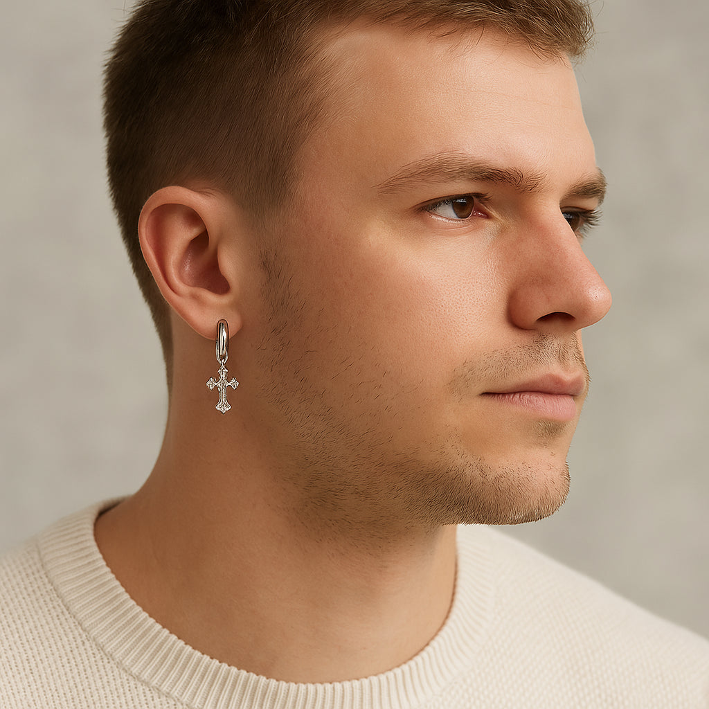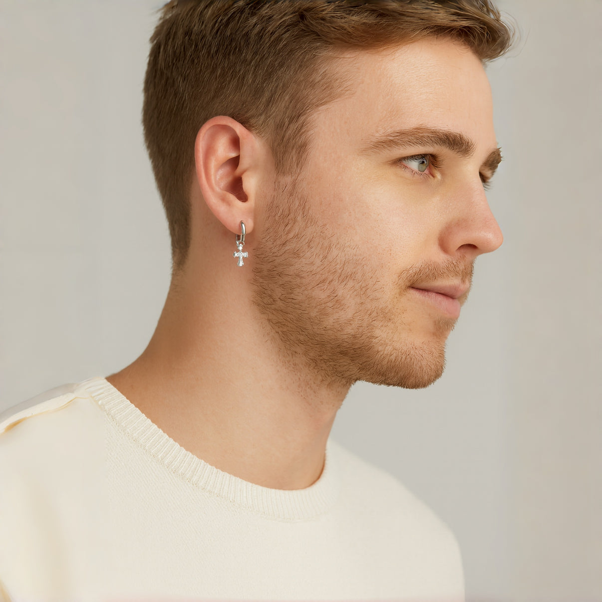 This elegant men's jewelry design showcases Clear CZ Cross men's earrings crafted from solid 925 sterling silver with a polished rhodium finish. The downward-hanging silhouette highlights brightness, clarity, and modern masculine style. Perfect for men who enjoy expressive accessories, these earrings elevate everyday and special-occasion looks with confidence.
