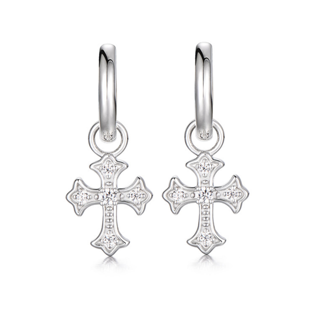 Sterling Silver Clear CZ Cross Drop Earrings – Rhodium Finish