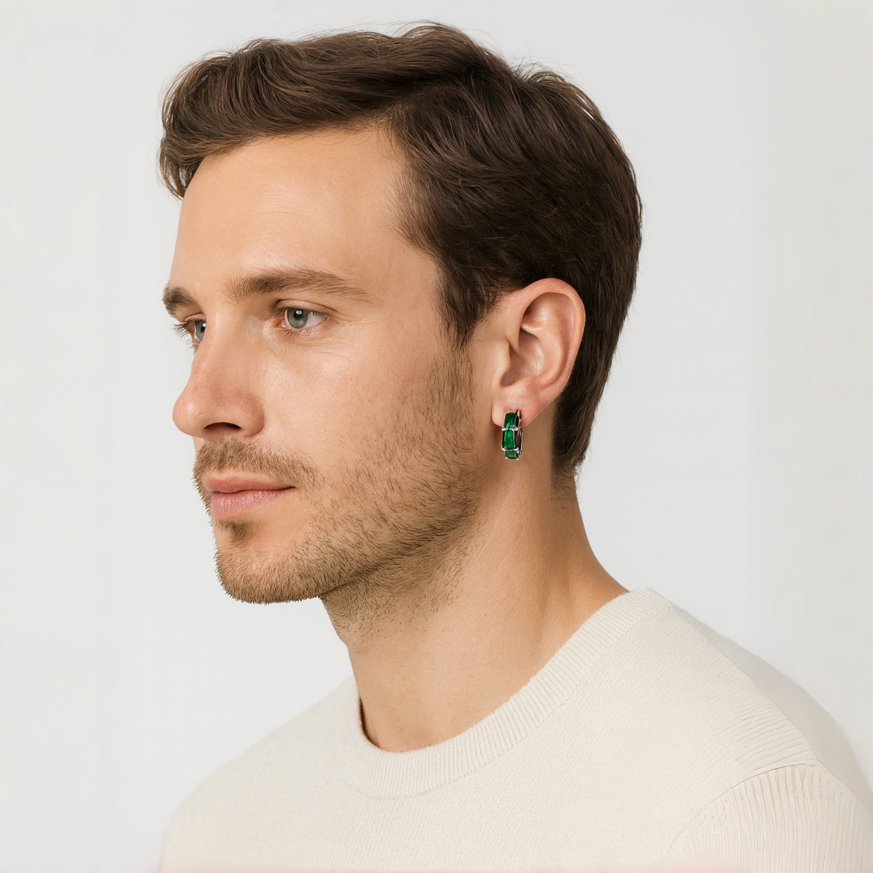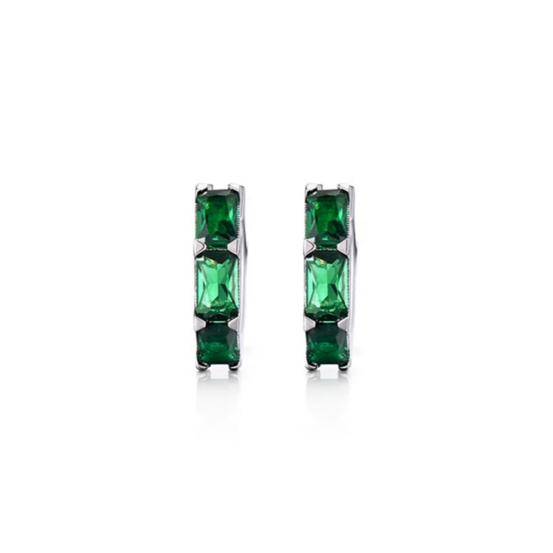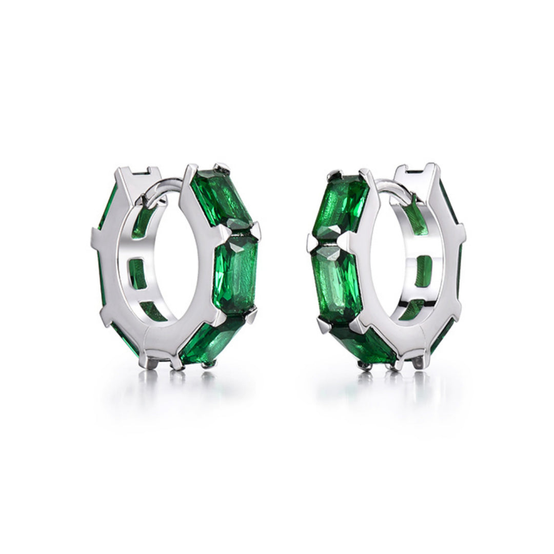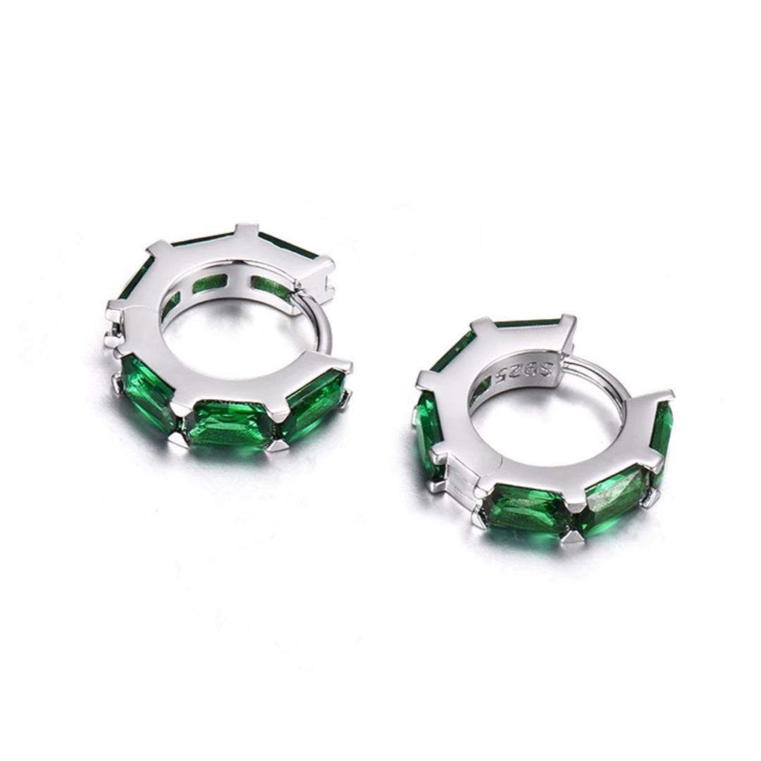This refined men's jewelry design showcases Green CZ Huggie Hoop men's earrings crafted from solid 925 sterling silver with a polished rhodium finish. The vibrant green stones add a fresh, modern edge while the huggie profile ensures a secure and comfortable fit. Perfect for men seeking subtle elegance with a bold color accent, ideal for daily wear or night-out styling.