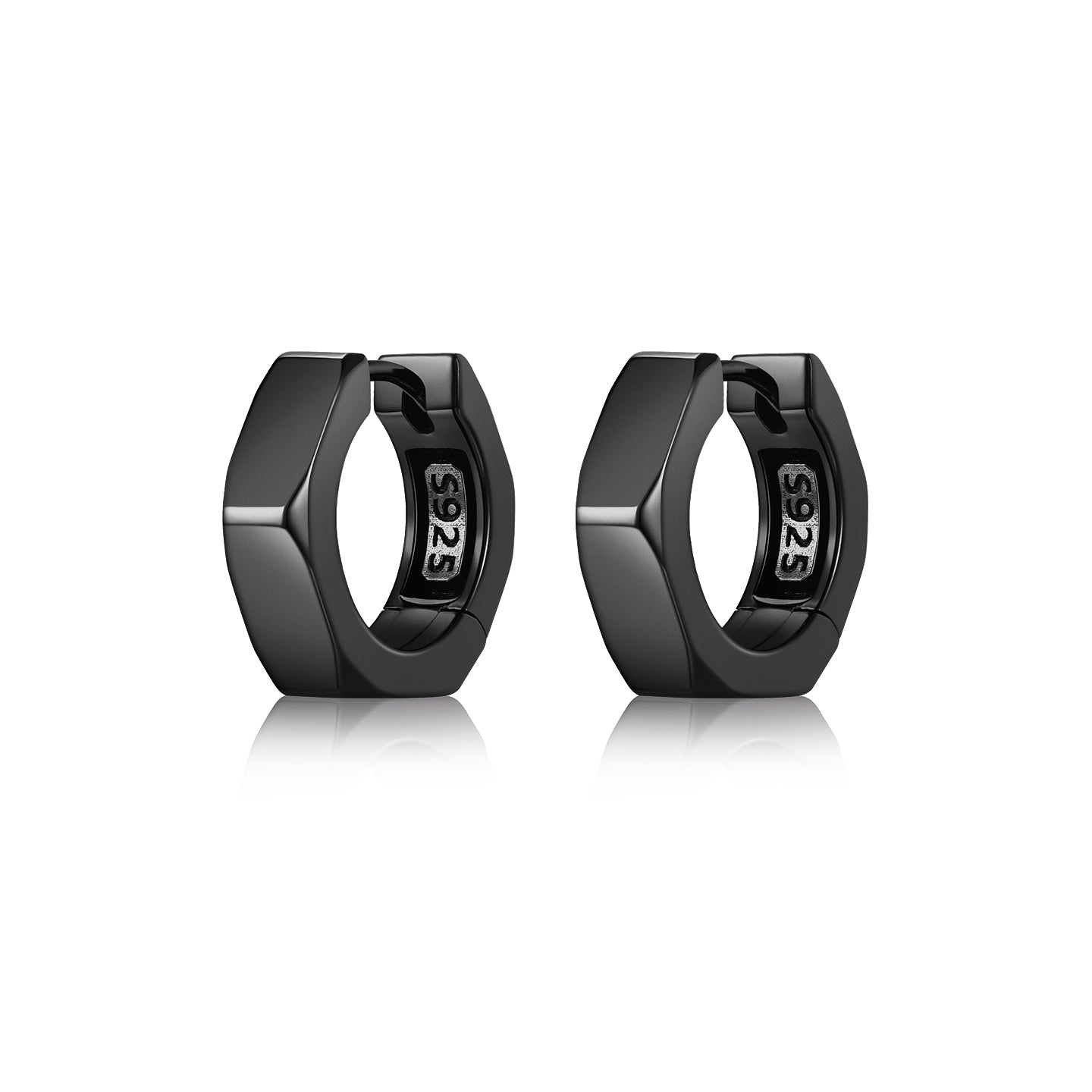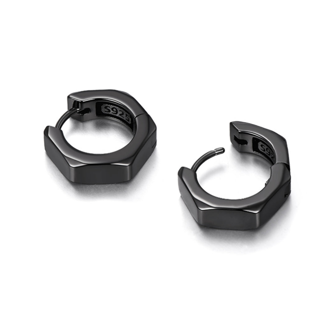 This modern men's jewelry piece showcases Hexagon Huggie men's earrings crafted from solid 925 sterling silver with a sleek black rhodium finish. The geometric shape adds sharp style and a contemporary edge, ideal for men who prefer clean lines and subtle attitude. Perfect for daily wear, these earrings deliver confidence, durability, and refined masculine appeal.