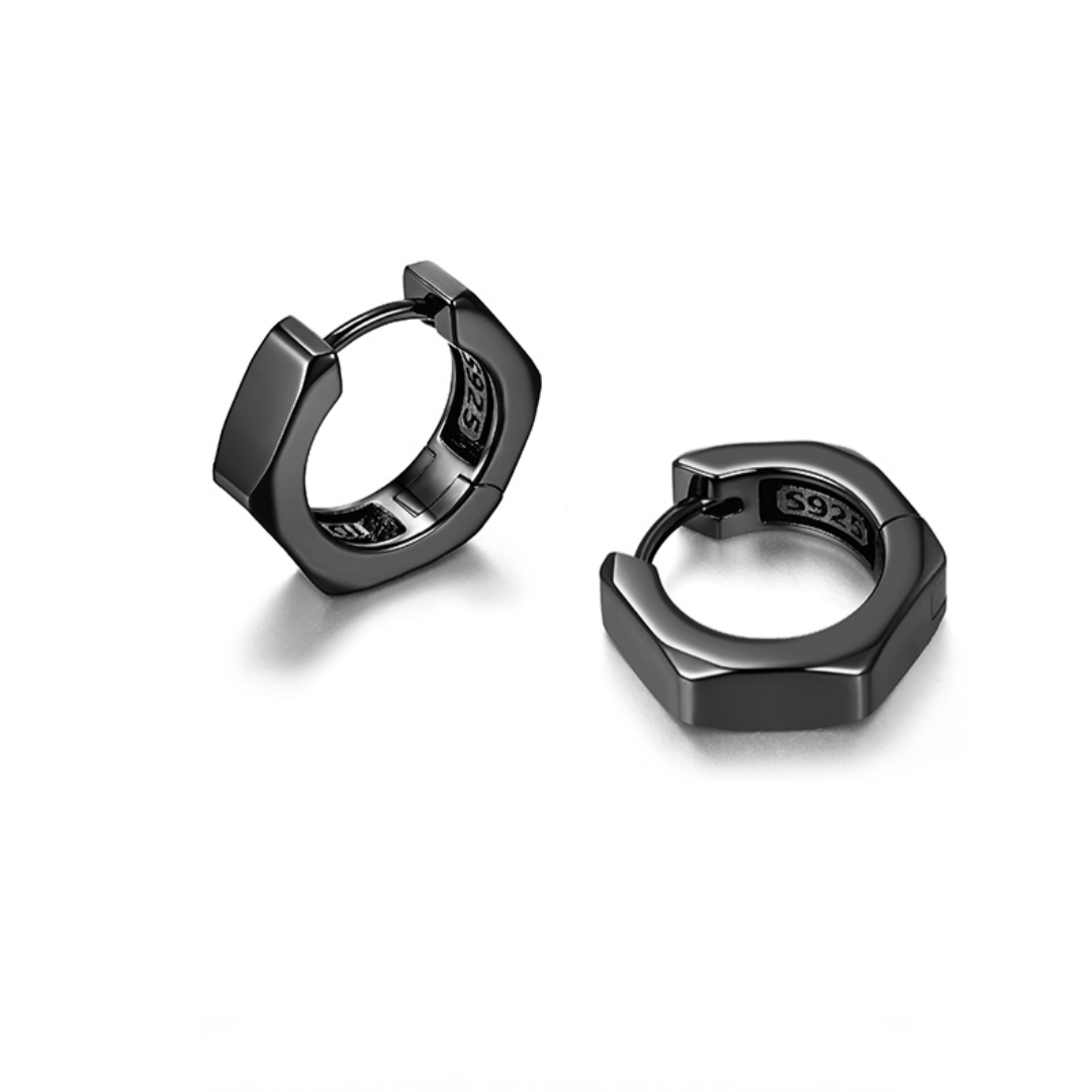 Sterling Silver Hexagon Huggie Hoop Earrings – Black Rhodium Finish
