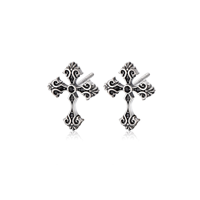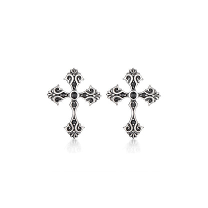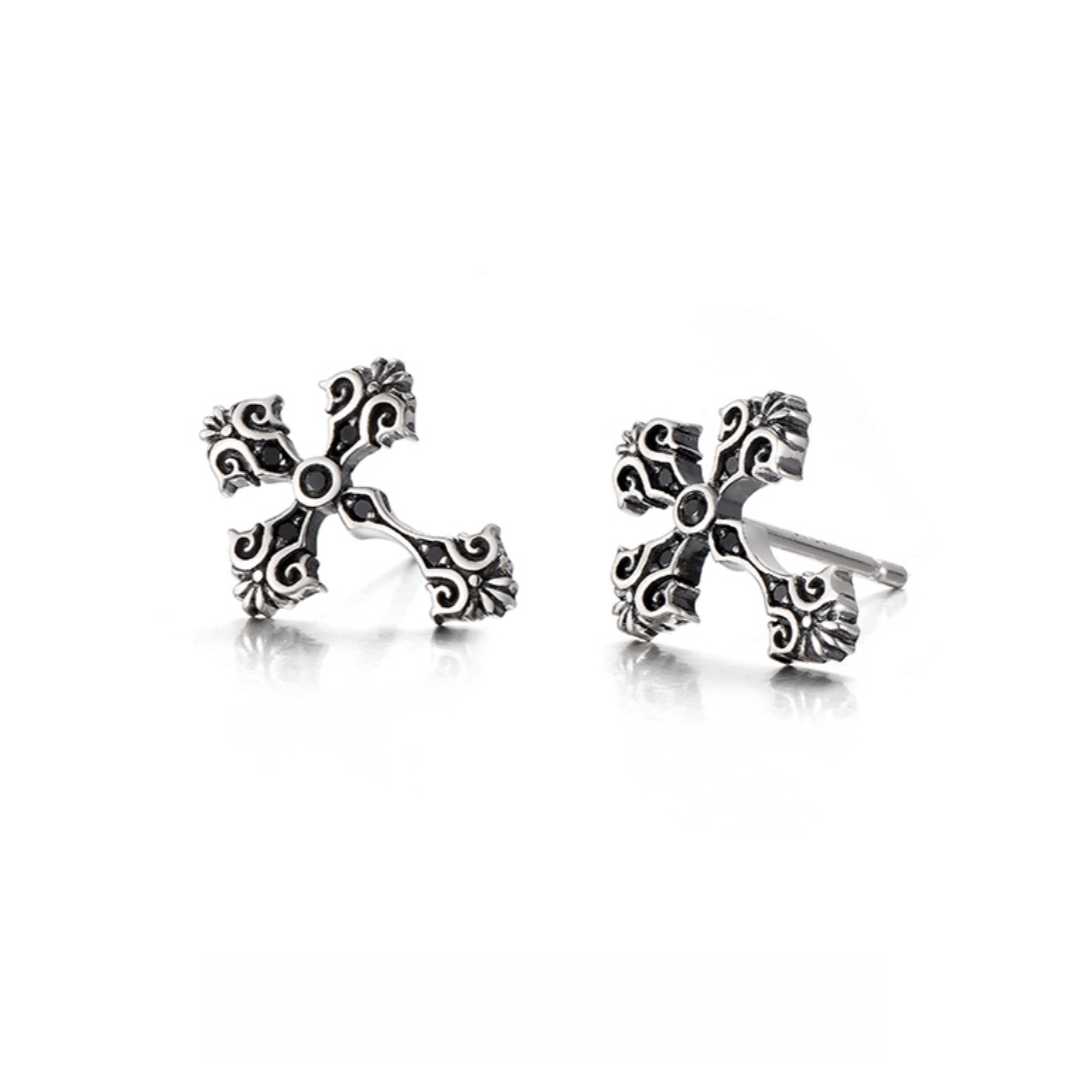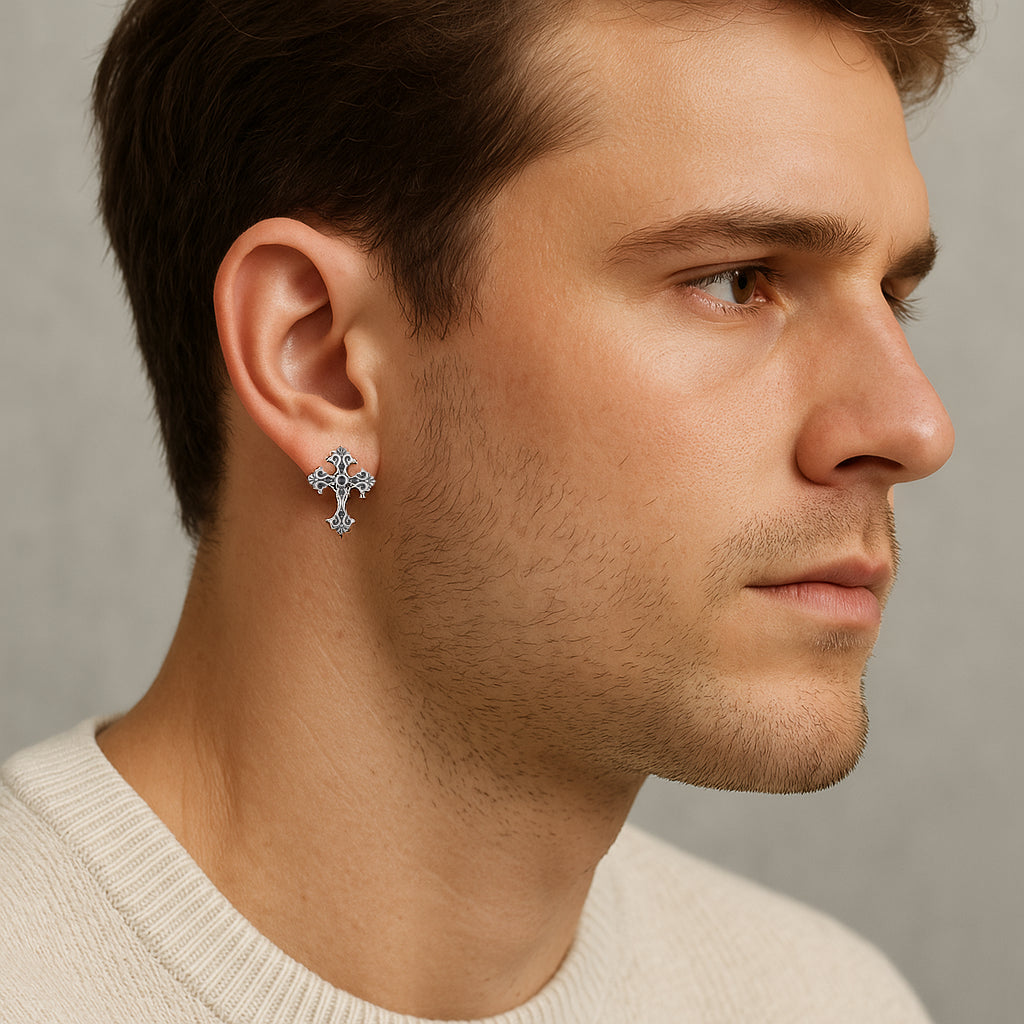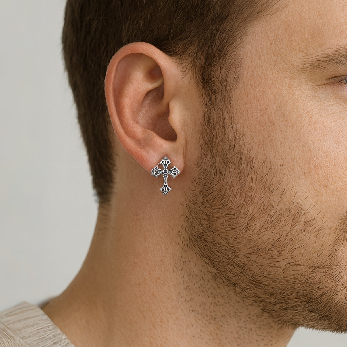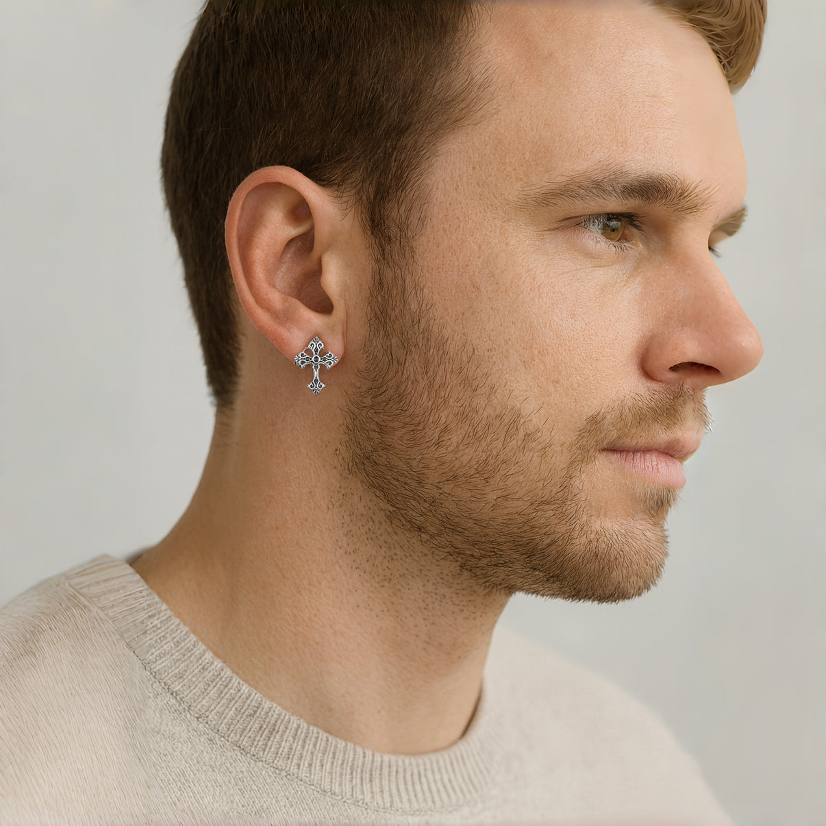 This distinctive men's jewelry design showcases Vintage Cross men's earrings crafted from solid 925 sterling silver with an oxidized silver finish for added depth and character. The retro details create a rugged yet refined aesthetic, perfect for men who appreciate meaningful craftsmanship and expressive style. These studs bring confidence and timeless edge to everyday looks.